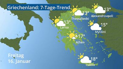Das Video zeigt die aktuelle Wetterprognose für Griechenland. Bei Touristen ist dieses Land an Mittelmeer und Ägäis beliebt. Wer seinen Urlaub an den Stränden von Kreta, anderen griechischen Inseln oder vom Festland verbringen will, kann hier die Wetteraussichten für 7 Tage prüfen. Gibt es schönes Wetter, oder muss Regen einkalkuliert werden? Wie heiß wird es? Die Animation zeigt Wettersymbole als Vorschau für verschiedene Orte in Griechenland: Athen, Iraklio (auf Kreta), Mytilini (auf Lesbos), Larisa, Thessaloniki und Alexandroupoli. Prognose vom 14. Januar 2026 um 02:30 Uhr