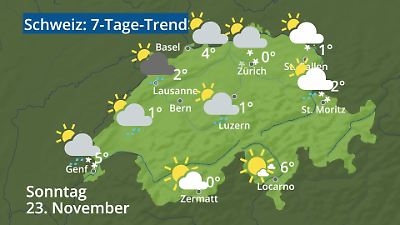 Das Video zeigt den Wettertrend für die Schweiz. Regen, Schnee, Sonne, Wolken oder Gewitter werden als Wettersymbole für die folgenden Städte in der Schweiz angezeigt: Bern, Basel, Genf, Zürich, St. Moritz (Graubünden), Locarno (Tessin), Zermatt (Wallis), Lausanne (Waadt) und St. Gallen. Diese Wettervorschau kann helfen, den Urlaub in der Schweiz zu planen. Prognose vom 21. November 2025 um 02:30 Uhr