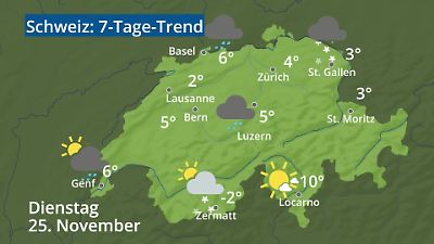 Das Video zeigt den Wettertrend für die Schweiz. Regen, Schnee, Sonne, Wolken oder Gewitter werden als Wettersymbole für die folgenden Städte in der Schweiz angezeigt: Bern, Basel, Genf, Zürich, St. Moritz (Graubünden), Locarno (Tessin), Zermatt (Wallis), Lausanne (Waadt) und St. Gallen. Diese Wettervorschau kann helfen, den Urlaub in der Schweiz zu planen. Prognose vom 23. November 2025 um 02:30 Uhr