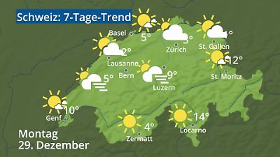 Das Video zeigt den Wettertrend für die Schweiz. Regen, Schnee, Sonne, Wolken oder Gewitter werden als Wettersymbole für die folgenden Städte in der Schweiz angezeigt: Bern, Basel, Genf, Zürich, St. Moritz (Graubünden), Locarno (Tessin), Zermatt (Wallis), Lausanne (Waadt) und St. Gallen. Diese Wettervorschau kann helfen, den Urlaub in der Schweiz zu planen. Prognose vom 27. Dezember 2025 um 02:30 Uhr