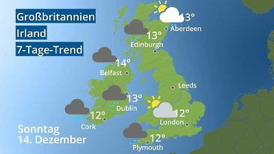 Dieses Video zeigt die Wettervorhersage für England, Schottland, Irland und Wales. Für die Städte London, Edinburgh, Dublin, Cork, Belfast, Plymouth, Leeds und Aberdeen wird ein Wettersymbol mit Temperatur in Grad Celsius angegeben. Sonne, Regen, Gewitter, Wolken oder Schnee werden angezeigt. Prognose vom 12. Dezember 2025 um 02:30 Uhr