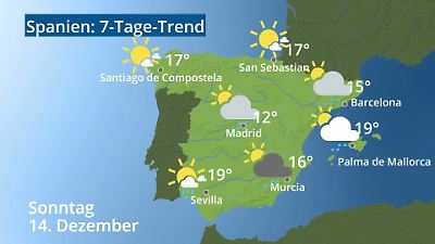 Das Video zeigt die Wettervorhersage für Spanien. Wie warm wird es? Regnet es? Für die Städte Palma de Mallorca, Madrid, Barcelona, Sevilla, San Sebastian, Santiago de Compostela und Murcia wird die Wetterprognose als Symbol mit Temperatur angezeigt. Damit haben Sie einen Überblick über das Wetter in ganz Spanien. Prognose vom 12. Dezember 2025 um 02:30 Uhr