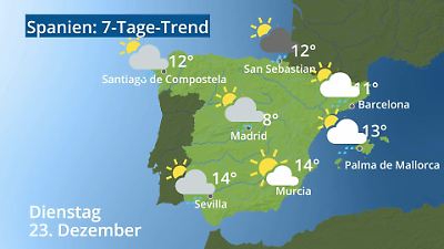 Das Video zeigt die Wettervorhersage für Spanien. Wie warm wird es? Regnet es? Für die Städte Palma de Mallorca, Madrid, Barcelona, Sevilla, San Sebastian, Santiago de Compostela und Murcia wird die Wetterprognose als Symbol mit Temperatur angezeigt. Damit haben Sie einen Überblick über das Wetter in ganz Spanien. Prognose vom 21. Dezember 2025 um 02:30 Uhr