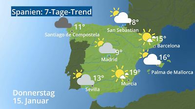 Das Video zeigt die Wettervorhersage für Spanien. Wie warm wird es? Regnet es? Für die Städte Palma de Mallorca, Madrid, Barcelona, Sevilla, San Sebastian, Santiago de Compostela und Murcia wird die Wetterprognose als Symbol mit Temperatur angezeigt. Damit haben Sie einen Überblick über das Wetter in ganz Spanien. Prognose vom 13. Januar 2026 um 02:30 Uhr