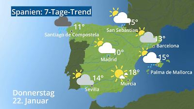 Das Video zeigt die Wettervorhersage für Spanien. Wie warm wird es? Regnet es? Für die Städte Palma de Mallorca, Madrid, Barcelona, Sevilla, San Sebastian, Santiago de Compostela und Murcia wird die Wetterprognose als Symbol mit Temperatur angezeigt. Damit haben Sie einen Überblick über das Wetter in ganz Spanien. Prognose vom 20. Januar 2026 um 02:30 Uhr
