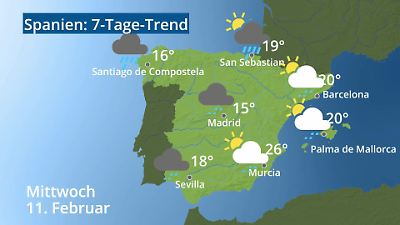 Das Video zeigt die Wettervorhersage für Spanien. Wie warm wird es? Regnet es? Für die Städte Palma de Mallorca, Madrid, Barcelona, Sevilla, San Sebastian, Santiago de Compostela und Murcia wird die Wetterprognose als Symbol mit Temperatur angezeigt. Damit haben Sie einen Überblick über das Wetter in ganz Spanien. Prognose vom 09. Februar 2026 um 02:30 Uhr