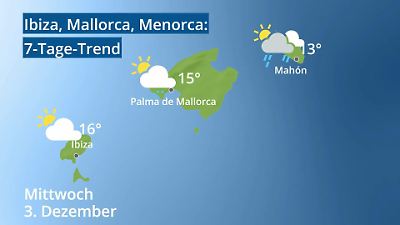 Das Video zeigt die Wettervorhersage für die beliebten Urlaubs-Inseln Mallorca, Ibiza und Menorca. Anhand der Wettersymbole können Sie erkennen ob es regnet, ob die Sonne scheint oder ob es Gewitter gibt. Wie warm es wird, können Sie an der Temperaturanzeige ablesen. Die Wetterprognose zeigt Werte für die Orte Ibiza, Palma de Mallorca und Mahon (auf Menorca) an. Prognose vom 01. Dezember 2025 um 02:30 Uhr