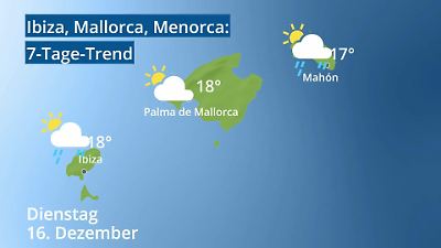Das Video zeigt die Wettervorhersage für die beliebten Urlaubs-Inseln Mallorca, Ibiza und Menorca. Anhand der Wettersymbole können Sie erkennen ob es regnet, ob die Sonne scheint oder ob es Gewitter gibt. Wie warm es wird, können Sie an der Temperaturanzeige ablesen. Die Wetterprognose zeigt Werte für die Orte Ibiza, Palma de Mallorca und Mahon (auf Menorca) an. Prognose vom 14. Dezember 2025 um 02:30 Uhr