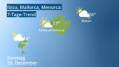 Das Video zeigt die Wettervorhersage für die beliebten Urlaubs-Inseln Mallorca, Ibiza und Menorca. Anhand der Wettersymbole können Sie erkennen ob es regnet, ob die Sonne scheint oder ob es Gewitter gibt. Wie warm es wird, können Sie an der Temperaturanzeige ablesen. Die Wetterprognose zeigt Werte für die Orte Ibiza, Palma de Mallorca und Mahon (auf Menorca) an. Prognose vom 26. Dezember 2025 um 02:30 Uhr