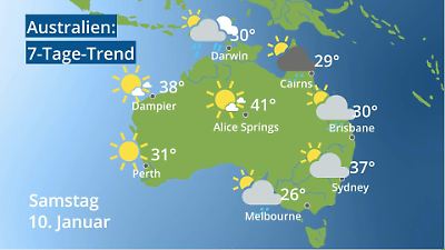 Das Video zeigt die Wetterprognose für Australien. Dort ist das Wetter entgegengesetzt zu unserem. Wenn in Deutschland Sommer ist, ist in Australien Winter und andersherum. Temperaturen und Wettersymbole werden für Sydney, Melbourne, Alice Springs, Perth, Dampier, Darwin, Cairns und Brisbane angezeigt. Weil das Land so riesig ist, kann sich das Wetter in Australien je nach Region erheblich unterscheiden. Prognose vom 08. Januar 2026 um 02:30 Uhr