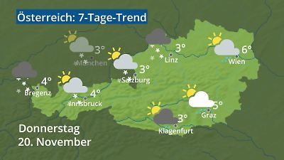 Das Video zeigt den Wetterbericht für Österreich. Wann regnet es? Wo fällt Schnee? Wie warm wird es? Gibt es Gewitter? Welches Wetter bringt das Wochenende? Die Animation zeigt die Wettervorhersage für Städte in Österreich: Wien, Salzburg, Innsbruck, Bregenz, Graz, Linz und Klagenfurt. Die Wetterprognose wird als Wettersymbol mit Höchsttemperatur in Grad Celsius dargestellt. Prognose vom 18. November 2025 um 02:30 Uhr