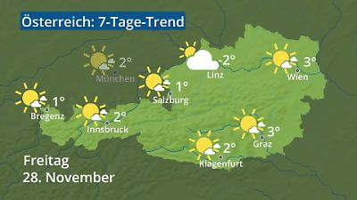 Das Video zeigt den Wetterbericht für Österreich. Wann regnet es? Wo fällt Schnee? Wie warm wird es? Gibt es Gewitter? Welches Wetter bringt das Wochenende? Die Animation zeigt die Wettervorhersage für Städte in Österreich: Wien, Salzburg, Innsbruck, Bregenz, Graz, Linz und Klagenfurt. Die Wetterprognose wird als Wettersymbol mit Höchsttemperatur in Grad Celsius dargestellt. Prognose vom 26. November 2025 um 02:30 Uhr