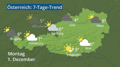 Das Video zeigt den Wetterbericht für Österreich. Wann regnet es? Wo fällt Schnee? Wie warm wird es? Gibt es Gewitter? Welches Wetter bringt das Wochenende? Die Animation zeigt die Wettervorhersage für Städte in Österreich: Wien, Salzburg, Innsbruck, Bregenz, Graz, Linz und Klagenfurt. Die Wetterprognose wird als Wettersymbol mit Höchsttemperatur in Grad Celsius dargestellt. Prognose vom 29. November 2025 um 02:30 Uhr