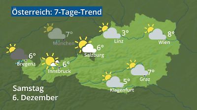 Das Video zeigt den Wetterbericht für Österreich. Wann regnet es? Wo fällt Schnee? Wie warm wird es? Gibt es Gewitter? Welches Wetter bringt das Wochenende? Die Animation zeigt die Wettervorhersage für Städte in Österreich: Wien, Salzburg, Innsbruck, Bregenz, Graz, Linz und Klagenfurt. Die Wetterprognose wird als Wettersymbol mit Höchsttemperatur in Grad Celsius dargestellt. Prognose vom 04. Dezember 2025 um 02:30 Uhr