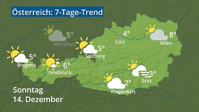 Das Video zeigt den Wetterbericht für Österreich. Wann regnet es? Wo fällt Schnee? Wie warm wird es? Gibt es Gewitter? Welches Wetter bringt das Wochenende? Die Animation zeigt die Wettervorhersage für Städte in Österreich: Wien, Salzburg, Innsbruck, Bregenz, Graz, Linz und Klagenfurt. Die Wetterprognose wird als Wettersymbol mit Höchsttemperatur in Grad Celsius dargestellt. Prognose vom 12. Dezember 2025 um 02:30 Uhr