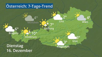 Das Video zeigt den Wetterbericht für Österreich. Wann regnet es? Wo fällt Schnee? Wie warm wird es? Gibt es Gewitter? Welches Wetter bringt das Wochenende? Die Animation zeigt die Wettervorhersage für Städte in Österreich: Wien, Salzburg, Innsbruck, Bregenz, Graz, Linz und Klagenfurt. Die Wetterprognose wird als Wettersymbol mit Höchsttemperatur in Grad Celsius dargestellt. Prognose vom 14. Dezember 2025 um 02:30 Uhr