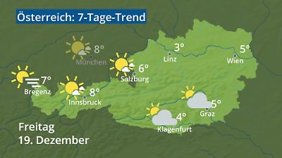 Das Video zeigt den Wetterbericht für Österreich. Wann regnet es? Wo fällt Schnee? Wie warm wird es? Gibt es Gewitter? Welches Wetter bringt das Wochenende? Die Animation zeigt die Wettervorhersage für Städte in Österreich: Wien, Salzburg, Innsbruck, Bregenz, Graz, Linz und Klagenfurt. Die Wetterprognose wird als Wettersymbol mit Höchsttemperatur in Grad Celsius dargestellt. Prognose vom 17. Dezember 2025 um 02:30 Uhr