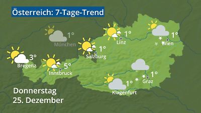Das Video zeigt den Wetterbericht für Österreich. Wann regnet es? Wo fällt Schnee? Wie warm wird es? Gibt es Gewitter? Welches Wetter bringt das Wochenende? Die Animation zeigt die Wettervorhersage für Städte in Österreich: Wien, Salzburg, Innsbruck, Bregenz, Graz, Linz und Klagenfurt. Die Wetterprognose wird als Wettersymbol mit Höchsttemperatur in Grad Celsius dargestellt. Prognose vom 23. Dezember 2025 um 02:30 Uhr