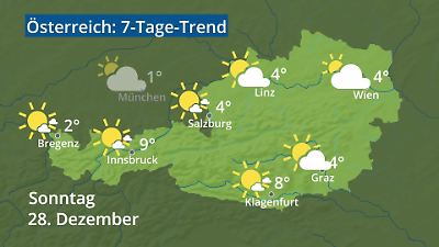 Das Video zeigt den Wetterbericht für Österreich. Wann regnet es? Wo fällt Schnee? Wie warm wird es? Gibt es Gewitter? Welches Wetter bringt das Wochenende? Die Animation zeigt die Wettervorhersage für Städte in Österreich: Wien, Salzburg, Innsbruck, Bregenz, Graz, Linz und Klagenfurt. Die Wetterprognose wird als Wettersymbol mit Höchsttemperatur in Grad Celsius dargestellt. Prognose vom 26. Dezember 2025 um 02:30 Uhr