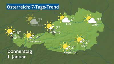 Das Video zeigt den Wetterbericht für Österreich. Wann regnet es? Wo fällt Schnee? Wie warm wird es? Gibt es Gewitter? Welches Wetter bringt das Wochenende? Die Animation zeigt die Wettervorhersage für Städte in Österreich: Wien, Salzburg, Innsbruck, Bregenz, Graz, Linz und Klagenfurt. Die Wetterprognose wird als Wettersymbol mit Höchsttemperatur in Grad Celsius dargestellt. Prognose vom 30. Dezember 2025 um 02:30 Uhr