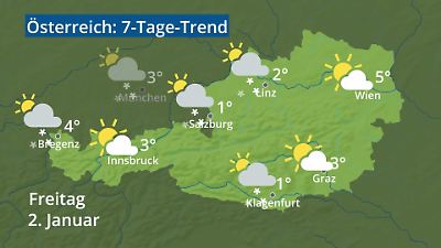 Das Video zeigt den Wetterbericht für Österreich. Wann regnet es? Wo fällt Schnee? Wie warm wird es? Gibt es Gewitter? Welches Wetter bringt das Wochenende? Die Animation zeigt die Wettervorhersage für Städte in Österreich: Wien, Salzburg, Innsbruck, Bregenz, Graz, Linz und Klagenfurt. Die Wetterprognose wird als Wettersymbol mit Höchsttemperatur in Grad Celsius dargestellt. Prognose vom 31. Dezember 2025 um 02:30 Uhr
