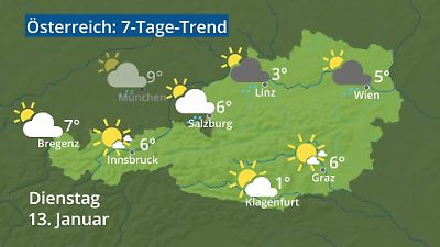 Das Video zeigt den Wetterbericht für Österreich. Wann regnet es? Wo fällt Schnee? Wie warm wird es? Gibt es Gewitter? Welches Wetter bringt das Wochenende? Die Animation zeigt die Wettervorhersage für Städte in Österreich: Wien, Salzburg, Innsbruck, Bregenz, Graz, Linz und Klagenfurt. Die Wetterprognose wird als Wettersymbol mit Höchsttemperatur in Grad Celsius dargestellt. Prognose vom 11. Januar 2026 um 02:30 Uhr