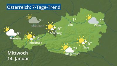 Das Video zeigt den Wetterbericht für Österreich. Wann regnet es? Wo fällt Schnee? Wie warm wird es? Gibt es Gewitter? Welches Wetter bringt das Wochenende? Die Animation zeigt die Wettervorhersage für Städte in Österreich: Wien, Salzburg, Innsbruck, Bregenz, Graz, Linz und Klagenfurt. Die Wetterprognose wird als Wettersymbol mit Höchsttemperatur in Grad Celsius dargestellt. Prognose vom 12. Januar 2026 um 02:30 Uhr