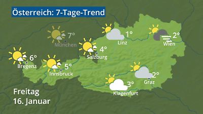 Das Video zeigt den Wetterbericht für Österreich. Wann regnet es? Wo fällt Schnee? Wie warm wird es? Gibt es Gewitter? Welches Wetter bringt das Wochenende? Die Animation zeigt die Wettervorhersage für Städte in Österreich: Wien, Salzburg, Innsbruck, Bregenz, Graz, Linz und Klagenfurt. Die Wetterprognose wird als Wettersymbol mit Höchsttemperatur in Grad Celsius dargestellt. Prognose vom 14. Januar 2026 um 02:30 Uhr