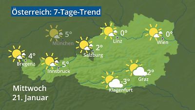 Das Video zeigt den Wetterbericht für Österreich. Wann regnet es? Wo fällt Schnee? Wie warm wird es? Gibt es Gewitter? Welches Wetter bringt das Wochenende? Die Animation zeigt die Wettervorhersage für Städte in Österreich: Wien, Salzburg, Innsbruck, Bregenz, Graz, Linz und Klagenfurt. Die Wetterprognose wird als Wettersymbol mit Höchsttemperatur in Grad Celsius dargestellt. Prognose vom 19. Januar 2026 um 02:30 Uhr