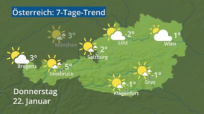 Das Video zeigt den Wetterbericht für Österreich. Wann regnet es? Wo fällt Schnee? Wie warm wird es? Gibt es Gewitter? Welches Wetter bringt das Wochenende? Die Animation zeigt die Wettervorhersage für Städte in Österreich: Wien, Salzburg, Innsbruck, Bregenz, Graz, Linz und Klagenfurt. Die Wetterprognose wird als Wettersymbol mit Höchsttemperatur in Grad Celsius dargestellt. Prognose vom 20. Januar 2026 um 02:30 Uhr