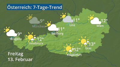 Das Video zeigt den Wetterbericht für Österreich. Wann regnet es? Wo fällt Schnee? Wie warm wird es? Gibt es Gewitter? Welches Wetter bringt das Wochenende? Die Animation zeigt die Wettervorhersage für Städte in Österreich: Wien, Salzburg, Innsbruck, Bregenz, Graz, Linz und Klagenfurt. Die Wetterprognose wird als Wettersymbol mit Höchsttemperatur in Grad Celsius dargestellt. Prognose vom 11. Februar 2026 um 02:30 Uhr