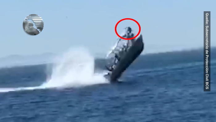 Aus dem Nichts meterhoch in die Luft geschleudert! Ein Video der staatlichen mexikanischen Zivilschutzbehörde zeigt das kleine Touristenboot, wie es offenbar mit einem Meeresbewohner zusammenstößt und aus dem Wasser in die Höhe katapultiert wird. Durch die Wucht des Aufpralls verlieren die 6 Menschen an Bord den Halt - einer fliegt sogar durch das Dach des Boots ins Wasser. 3 Kinder erleiden leichte Verletzungen, 3 Erwachsene mussten nach dem Vorfall ins Krankenhaus eingeliefert werden.