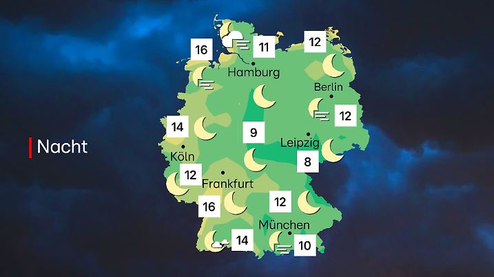 Die Nacht verläuft meist sternenklar und ruhig. Bei 16 bis 8 Grad wird es recht frisch, in manchen Senken der Mittelgebirge kann sich sogar Bodenfrost zeigen. Am frühen Morgen entstehen örtliche Nebelfelder, die sich aber schnell wieder auflösen.