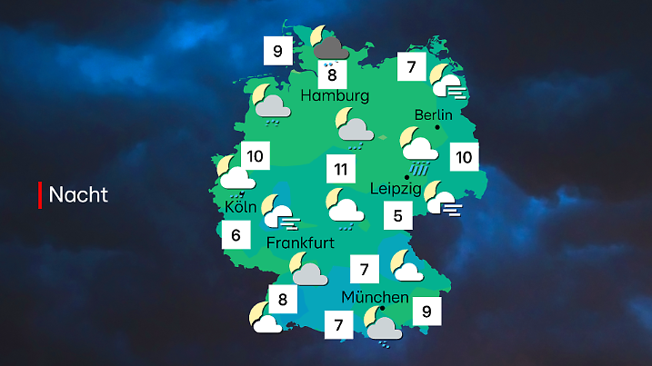Die letzten Regenwolken ziehen vom Abend in Richtung Nord/Nordosten ab, wo es auch weiterhin wolkig bleibt. In der Nacht sind noch Gewitter rund um Sachsen-Anhalt und Brandenburg möglich, auch Starkregen kann dazu kommen. Für die restlichen Teile von Deutschland kommt es nur selten zu Schauern, der Himmel klart stellenweise sogar auf. Im Nordosten und Südosten bildet sich örtlich zäher Nebel. Die Tiefstwerte sind bei frischen 5 bis 11 Grad.