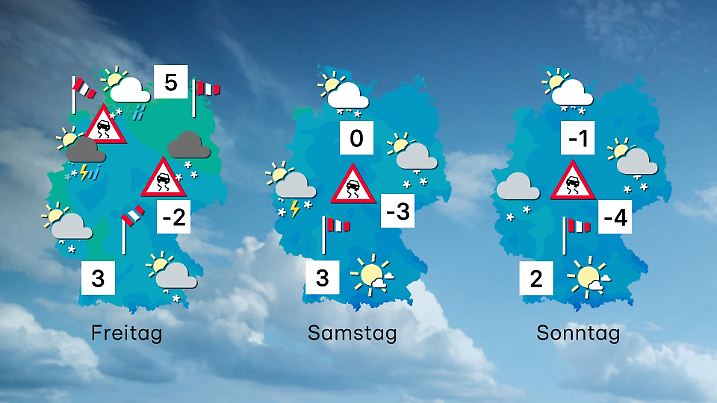 Die Temperaturen gehen Schritt für Schritt zurück. Liegen sie am Freitag noch zwischen -2 und 5 Grad, sind am Sonntag voraussichtlich nur noch -4 bis 2 Grad drin.
