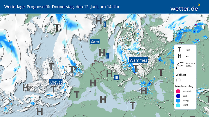 Der Hochdruckeinfluss über Deutschland verstärkt sich, zudem strömt in den nächsten Tagen sehr warme bis heiße Luft aus Spanien zu uns. Damit stehen im Südwesten des Landes die heißesten Tage des Jahres bevor, denn die 32,5 Grad vom 31. Mai 2025 dürften hier spätestens am Freitag (eventuell schon am Donnerstag) übertroffen werden. Donnerstag und Freitag werden richtig sonnig, Freitagabend sind an der Grenze zu Frankreich und Benelux erste Gewitter möglich. Am Samstag wird es in der Westhälfte sehr schwül und heiß, dazu drohen zunehmend heftige Gewitter und Unwetter. Diese verlagern sich am Sonntag in die Osthälfte Deutschlands.