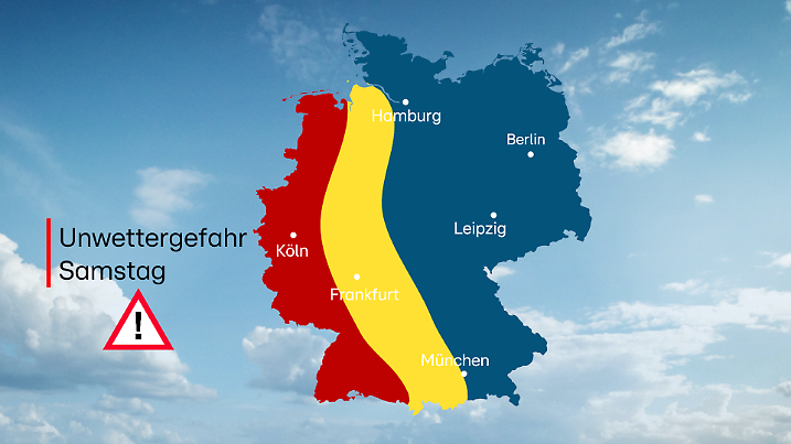 Samstag: In der Osthälfte sonnig und sehr warm bei 25 bis 30 Grad, in der Westhälfte sehr schwül und heiß bei 30 bis 35 Grad und im Tagesverlauf von Niedersachsen bis Baden-Württemberg sowie in den Alpen zunehmend Gefahr von heftigen Gewittern mit Unwetterpotenzial durch Starkregen, Hagel und Sturmböen.