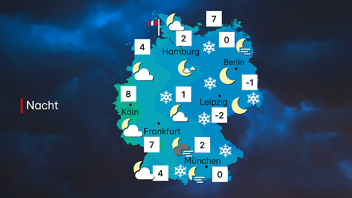 In der Nacht zum Sonntag friert der Osten bei bis zu minus 2 Grad, im Westen halten Wolken die Temperaturen bei milden sechs bis acht Grad.
