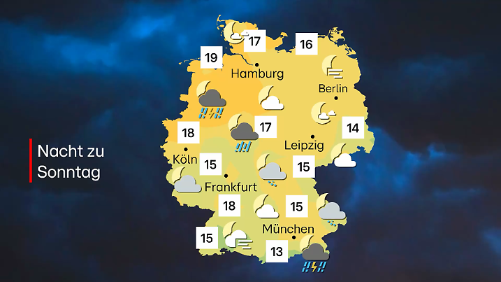 Es gab heute ja noch viel schönes Badewetter, allerdings wurde es im Westen und Südwesten zunehmend schwül und es brodelte in der Atmosphäre mit teils kräftigen Gewittern. Unwettergefahr aufgrund von Starkregen, Hagel und Sturmböen besteht jetzt vom Allgäu bis zum oberbayerischen Alpenrand und hält etwa bis 22 Uhr an. In der Nacht ziehen Gewitter ziehen von NRW (vor allem im Sauerland, in Ostwestfalen und im Münsterland) in den Nordwesten. Am östlichen Alpenrand klingen sie ab. Sonst bleiben auf dem Weg von Unterfranken und Hessen nach Thüringen und Ostbayern nur einzelne Schauer übrig. Im Nordosten bleibt es noch ruhig mit wenigen oder gar keinen Wolken am Himmel und auch vom Südwesten bis nach Hessen klart es auf. Stellenweise bildet sich Nebel. Nach der Ü30-Hitze sinken die Temperaturen auf 19 bis 13 Grad.