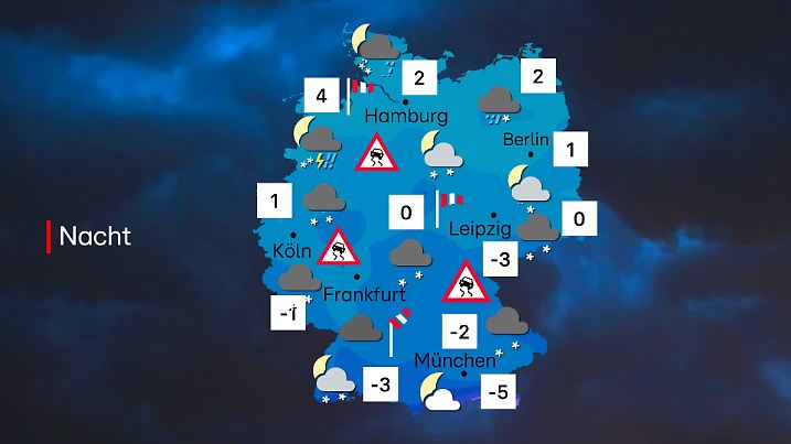Die Nacht bringt weitere Wolken, die Regen-, Schnee- und Graupelschauer im Gepäck haben. Vom Westen bis in die Mittelgebirge gibt es auch kräftigen Schneeregen oder Schnee. Im Osten sind die Schauer seltener, aber sie kommen überwiegend als Schnee runter. Vor allem von der südlichen bis in die nördliche Mitte besteht daher Glättegefahr. Am Hochrhein und in Alpennähe bleibt es meist trocken. Tiefstwerte im Norden und Osten 4 bis 0 Grad, in der Mitte und im Süden +1 bis -5 Grad, an den Alpen auch darunter. Frischer, teils starker Wind um West mit starken bis stürmischen Böen, an den Küsten Sturmböen, auf dem Brocken/Harz Böen von 100-120 km/h.