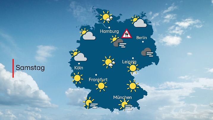 Am Samstag breitet sich Hochnebel bis in den Norden von Nordrhein-Westfalen und nach Sachsen aus. Örtlich besteht dabei Glättegefahr durch gefrierenden Sprühregen oder etwas Schneegriesel. Von Norden her lockert es später auf, während es in der Mitte und im Süden vielfach sonnig bleibt, regional vom Alpenrand bis zum Oberrhein hält sich zäher Nebel oder Hochnebel. In den Nebelgebieten bleiben die Temperaturen teils unter null Grad, sonst werden zwei bis acht Grad erreicht.
