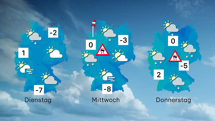 Am Dienstag ganz im Nordwesten weitere Schneeschauer und auch in den Südosten ziehen dichtere Wolken mit etwas Schnee. Dazwischen wird es neben dem Nebel oft freundlich und trocken. Nach frostig kalter bis eisig kalter Nacht auch tagsüber weiterhin fast überall dauerfrostig kalt mit -7 bis +1 Grad.